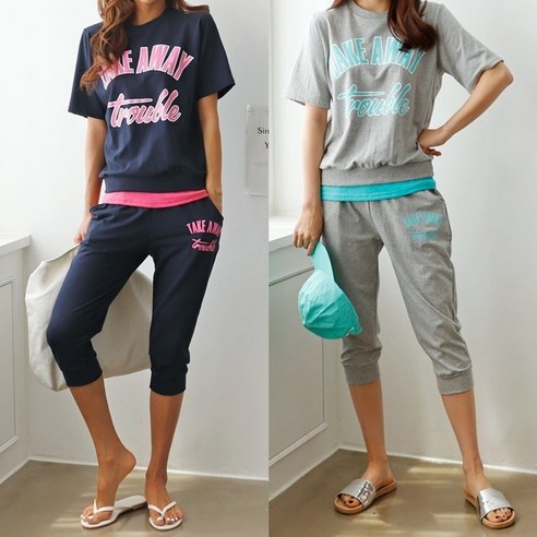 - 데일리 하게 입기 좋은 트레이닝 세트에요 적당한 핏 감의 세트 상품으로 레이어드 한 듯한 반팔티에 7부 기장의 허리 밴딩 팬츠가 편안하게 입기 좋아요~
