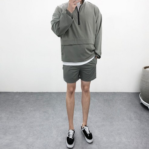 남자 오버핏 스판메쉬 반집업 아노락 맨투맨점퍼 기본 밴딩 트레이닝 반바지 3종세트