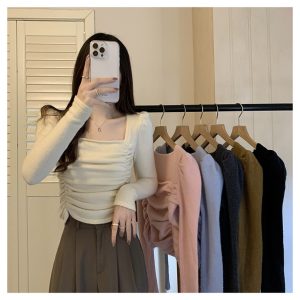 [Wake_Board] [판다샵] 여성 봄가을 셔링 스퀘어넥 니트 티셔츠